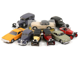 comprend : CITROEN 5 HP, PEUGEOT 172 R 1927 (2 exemplaires de couleurs différentes), FIAT 525 1928, CITROEN 11A 1936, SIMCA 1200, PORSCHE CARRERA 1500, MONTEVERDI 375L & TRIUMPH TR5 (avec boîte & bulletin d'inscription au club) - quelques carrosseries légèrement poussiéreuses
