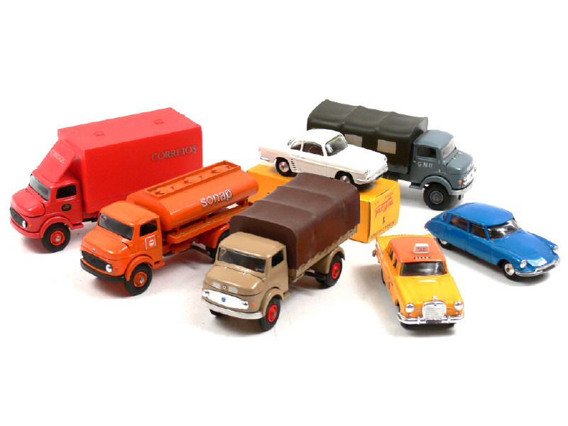 comprend : RENAULT FLORIDE (avec boîte), MERCEDES 200 TAXI D'AMSTERDAM, CITROEN DS 19, MERCEDES fourgon 'CORREIOS', MERCEDES citerne 'SONAP', MERCEDES bâché militaire 'GNR' & MERCEDES bâché civil - détails de peinture ajoutés sur les 2 camions bâchés