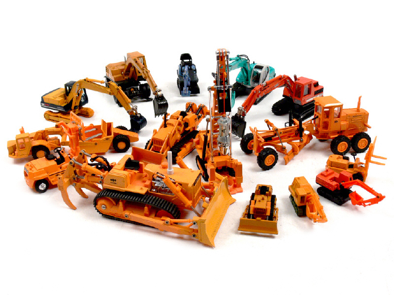 états de 'A' à 'B' - miniatures reproduisant les modèles : KOMATSU, KATO, AHI & KOBELCO - on y retrouve notamment les marques : YONEZAWA TOYS DIAPET, TOMICA DANDY & SHINSEI - un véhicule avec chenilles manquantes - petits manques