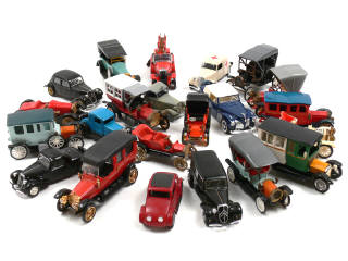 états de 'A' à 'C' - miniatures reproduisant notamment les modèles : BRASIER, HISPANO-SUIZA, LAURIN & KLEMENT, OPEL, FIAT, ALFA ROMEO, MERCEDES, LINCOLN, FORD, SIZAIRE & NAUDIN, CITROEN, ADLER, GOBRON & BRILLIE, DELAUNAY BELLEVILLE, HANOMAG, LORRAINE DIETRICH, BLITZEN BENZ, PEUGEOT, STUTZ & BERLIET- on y retrouve notamment les marques : JMK, RIO, ZISS-MODELL, CLE, TOOTSIETOY, EKO & R.W. MODELL - quelques véhicules transformés, un autre avec importantes traces d'humidité & un dernier avec présence de métal fatigue sur le toit - manques