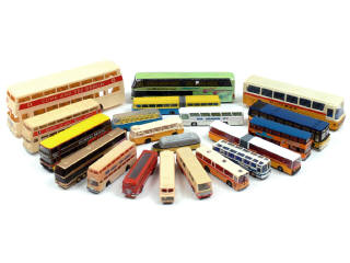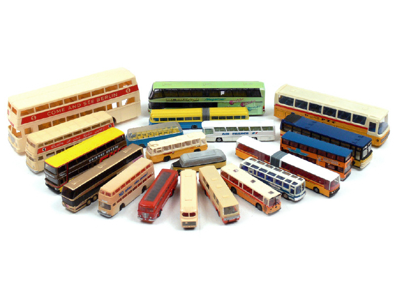 différentes échelles - états de 'A' à 'B' - miniatures reproduisant notamment les modèles : MERCEDES, NEOPLAN, HENSCHEL, SETRA, CAMETAL, DENNIS, MAN, BUSSING, ICARUS & SAURER - on y retrouve notamment les marques : HERPA, GALGO, MAJORETTE, AB, RIETZE & YONEZAWA TOYS DIAPET - 2 véhicules avec détails de peinture ajoutés, un autre repeint & un dernier décoloré
