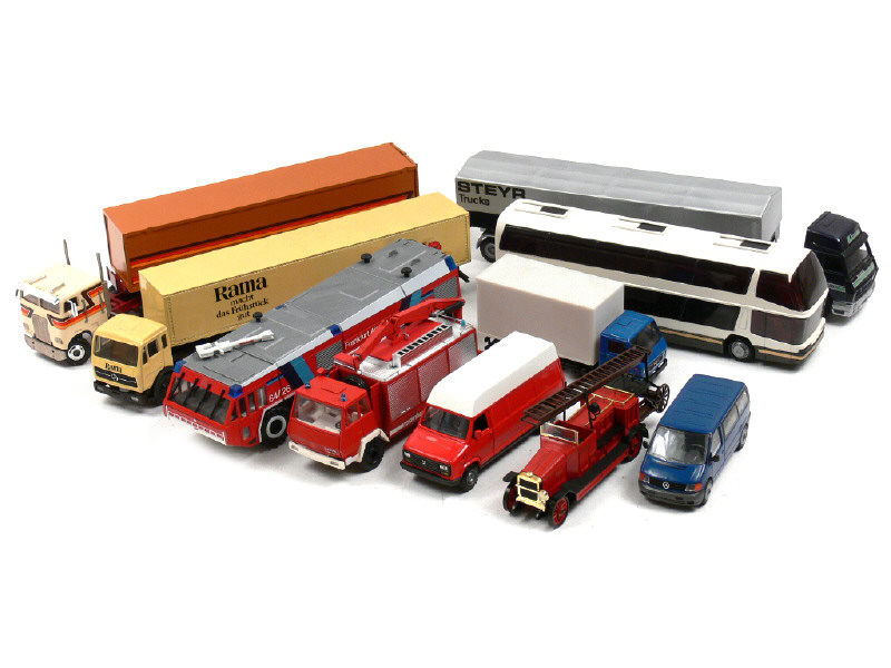 états de 'A' à 'B' - miniatures reproduisant les modèles : MAN, PEUGEOT, MERCEDES, SIMBA, NEOPLAN, STEYR, GRÄF & STIFT & FREIGHTLINER - on y retrouve notamment les marques CONRAD & NZG - quelques petits manques