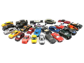 états de 'A' à 'B' - miniatures reproduisant notamment les modèles : MERCEDES, CHEVROLET, RENAULT, PONTIAC, SAAB, JEEP & JAGUAR - on y retrouve les marques : ROAD CHAMP, MC TOYS, SHB, RACING CHAMPIONS, UNIVERSAL HOBBIES & HONGWELL - 2 voitures de petite échelle - quelques petits manques