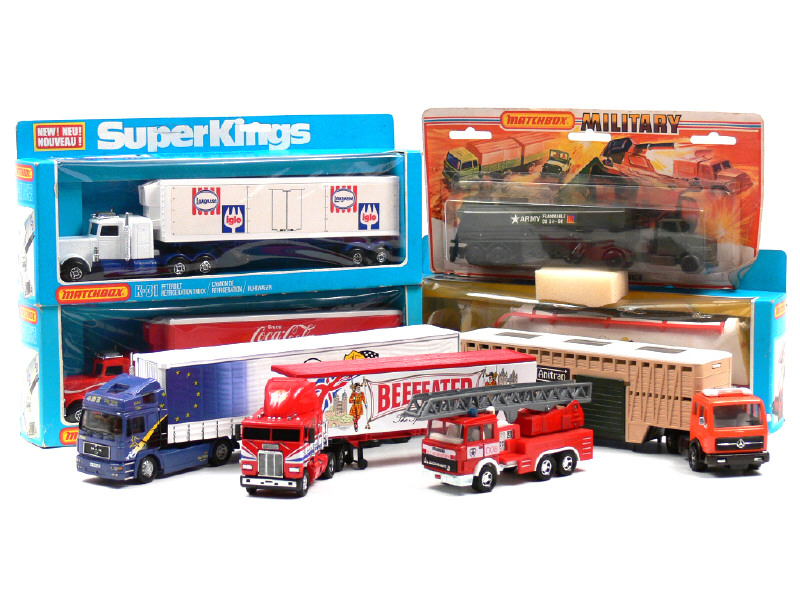 états de 'A' à 'B' - miniatures reproduisant les modèles : PETERBILT, BEDFORD, MERCEDES, MAGIRUS-DEUTZ, FORD, MAN & FREIGHTLINER - on y retrouve les marques : MATCHBOX & CORGI TOYS - 3 véhicules avec boîte & un autre sous blister jamais ouvert