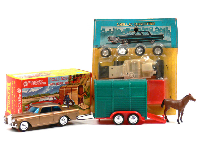 LUCKY (HONG KONG) 177/136 ROLLS ROYCE SILVER CLOUD III avec remorque-van & cheval doré métal, vert & rouge
