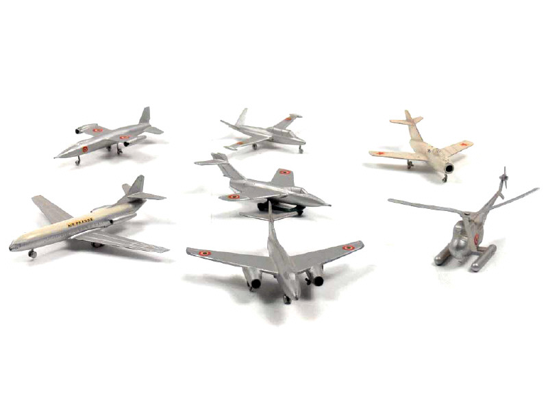 états de 'B' à 'D' - miniatures reproduisant les modèles : BAROUDEUR (avec son rare chariot), MIG 15, VAUTOUR, TRIDENT (traces de métal fatigue), FOUGA-MAGISTER, CARAVELLE 'AIR FRANCE' & SIKORSKY S55 (pales légèrement déformées)