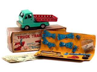 longueur du camion 10 cm - réalisation en tôle - moteur à friction (fonctionne) - différents accessoires fixés sur le carton de présentation permettent la construction d'une remorque - éléments jamais utilisés - avec notice