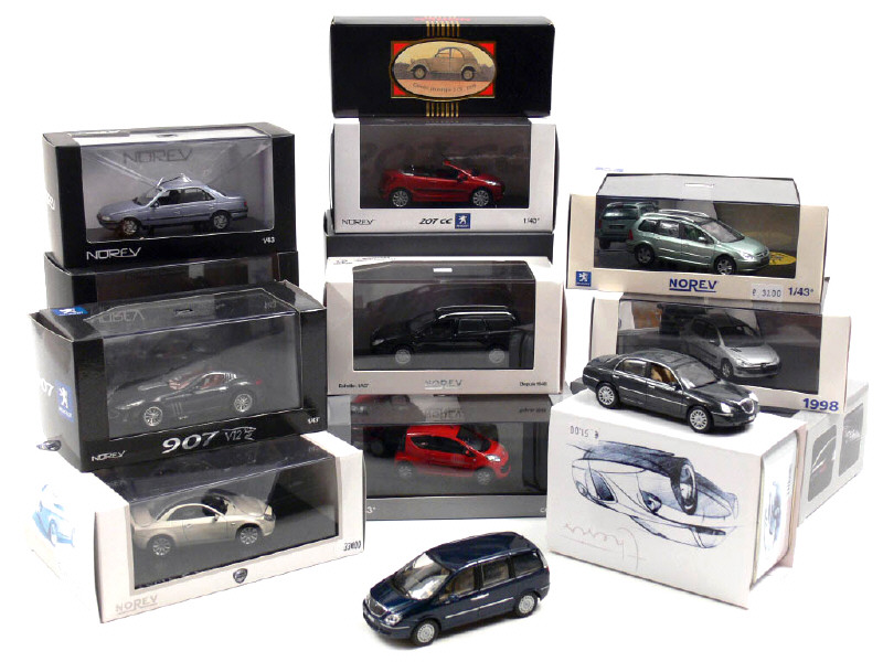 comprend : 3 LANCIA (FULVIA, THESIS & PHEDRA), 7 PEUGEOT (107, 207 CC, 206, 405 SRI, 907, 307 SW & 607), ALFA ROMEO 75, 3 CITROEN (2 CV prototypes 1939, C1 & C5 break) & RENAULT TALISMAN - 2 rétroviseurs cassés sur un modèle