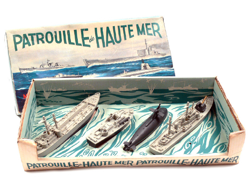 dimensions du coffret : 45 x 22 cm - réalisations en plastique - contient : un destroyer, un sous-marin, un ravitailleur de sous-marin & une vedette lance-torpilles - manque quelques petits accessoires