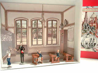 comprend : le maître d'école, trois écoliers & trois pupitres
