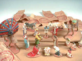 comprend : Jésus dans son berceau, Joseph, Marie, Gaspard, Balthazar, Melchior, un adorateur, une jeune fille en prière, deux fillettes en prière, un gamin en prière, deux chameliers, un chameau, un dromadaire avec son chargement, un âne, un boeuf & un mouton - avec sachet d'origine pour chacun des personnages - SUPERBE !