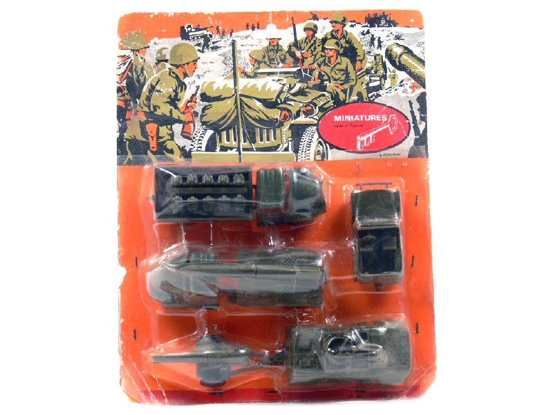 comprend : BERLIET lance-fusée, BERLIET transport de troupe, COMBAT CAR avec canon tracté & JEEP - sous blister jamais ouvert - agrafes oxydées