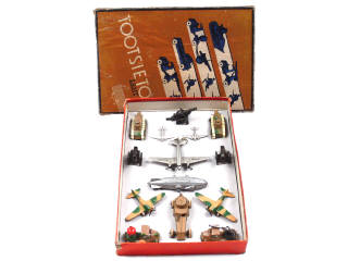états de 'A' à 'D' - réalisation des années 30 - contient : une automitrailleuse (pneus craquelés), un MACK projecteur antiaérien, un MACK canon antiaérien (pneus fondus), 2 avions de chasse monomoteur (un exemplaire avec ailes recollées & une pale d'hélice manquante), 2 avions bimoteur, un avion de transport, 3 canons tractés, 2 chars (chenilles remplacées) & un dirigeable - cale de boîte non d'origine - quelques axes de roues oxydés - présence d'un carton de renfort non d'origine à l'intérieur du couvercle - SUPERBE ENSEMBLE !