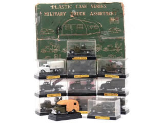 échelle HO - contient : projecteur antiaérien, radar, ambulance, porte-char (avec char), dépanneuse, toupie à béton (manque toupie), bâché, transport de chevaux, lance-missile, porte-tonneaux d'essence, fardier avec grumes & canon antiaérien - en boîte-vitrine individuelle (avec quelques petites fêlures) - fabrication des années 1950 - cales de boîte présentes - manque 3 étiquettes autocollantes de désignation - BEL ENSEMBLE !