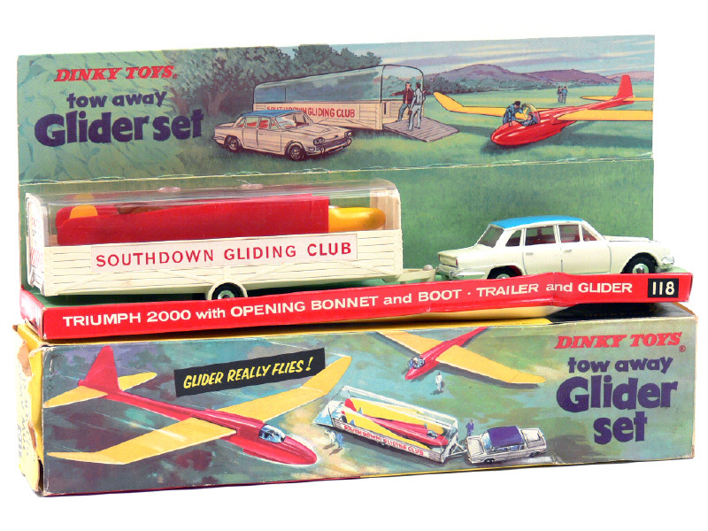DINKY TOYS (GB) 118 TRIUMPH 2000 & Remorque avec planeur crème, toit bleu