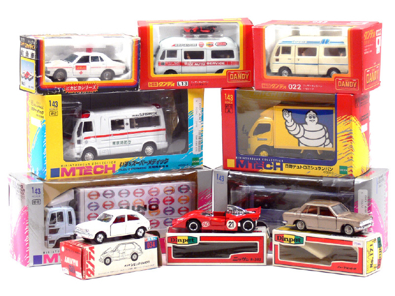 miniatures reproduisant notamment les modèles : NISSAN, HINO, ISUZU & HONDA - on y retrouve les marques : TOMICA DANDY, MTECH, SAKURA & YONEZAWA TOY DIAPET - quelques boîtes en état 'c'