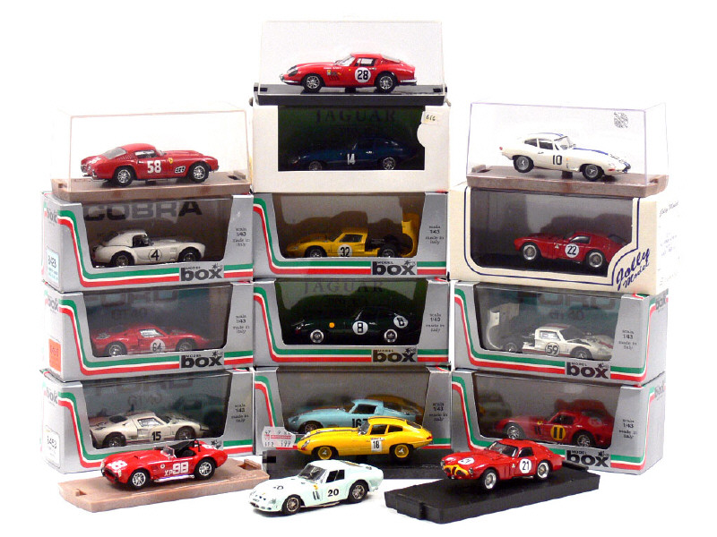 miniatures reproduisant les modèles : FERRARI, ALFA ROMEO, AC, FORD & JAGUAR - une voiture de la marque JOLLY MODEL - 6 surboîtes manquantes & un véhicule sans boîte