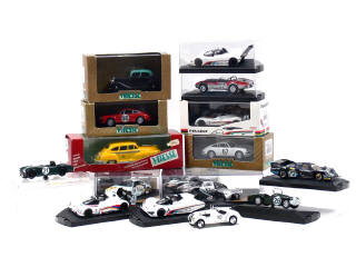 miniatures reproduisant les modèles : CHEVROLET, PEUGEOT, TRIUMPH, AUSTIN, PORSCHE, BMW (manque vitre de pare-brise), DE SOTO & MERCEDES - un véhicule de la marque TEAM T avec 2 jantes à recoller - manque une boîte - quelques surboîtes non conformes dont une en état 'd' & 4 manquantes