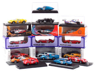miniatures reproduisant les modèles : FORD, FIAT ABARTH, LANCIA, ALPINE RENAULT, LOLA, FERRARI, MASERATI & SPYKER - on y retrouve les marques : REPLICARS, LE MANS 43, LA MINI MINIERA, BANG, PINKO & TOP MODEL - une boîte en état 'c'