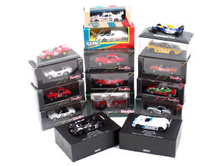 miniatures reproduisant les modèles : ALFA ROMEO, FERRARI, JAGUAR, Mc LAREN, WILLIAMS RENAULT, TRIUMPH, MG, VOLKSWAGEN PORSCHE, BMW & PORSCHE - on y retrouve les marques : MINICHAMPS, RECORD, DETAILCARS, CORGI & ART MODEL (sans surboîte & avec un petit élément manquant) - quelques surboîtes non conformes
