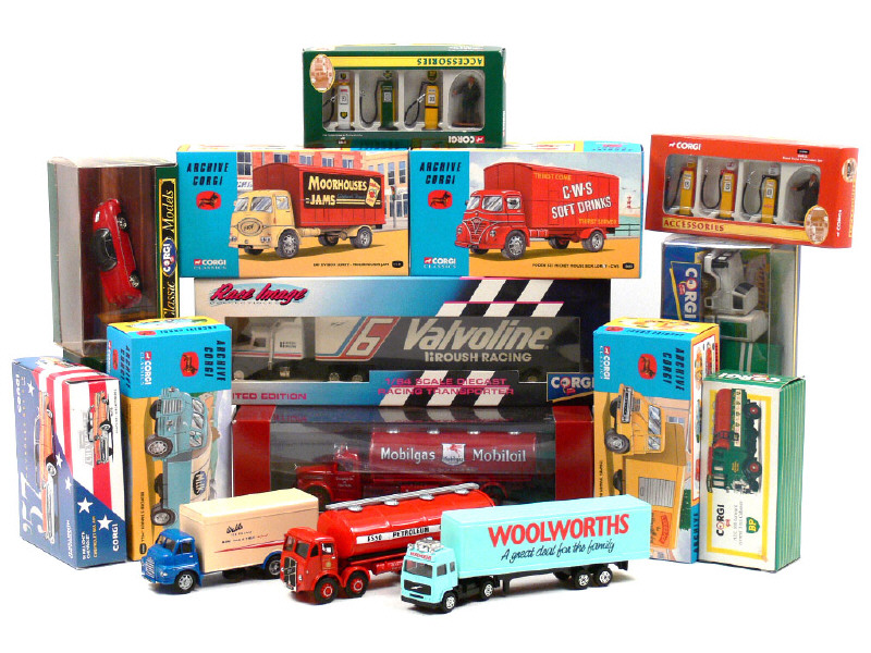 miniatures reproduisant les modèles : KENWORTH, AEC, ERF, MACK, CHEVROLET, BEDFORD, FODEN, FORD, MG, MORRIS, PORSCHE, THAMES, LEYLAND & VOLVO (sans boîte) - on y joint 2 coffrets d'accessoires de la marque