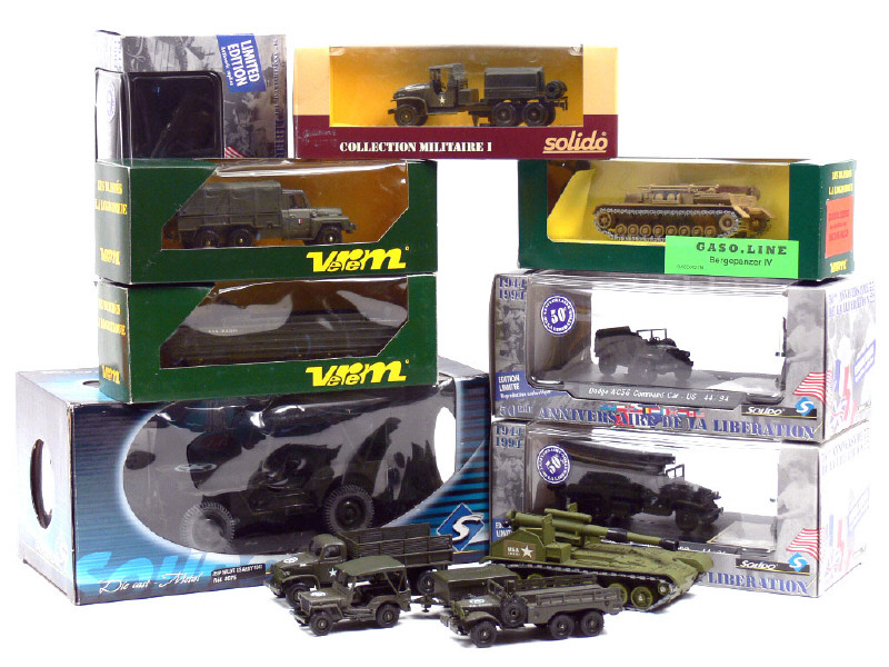 miniatures reproduisant notamment les modèles : ACMAT, DODGE, GMC, JEEP (un véhicule à l'échelle 1/18ème), PANHARD, AMX, SHERMAN, PT 76, DUKW, BERGEPANZER & BERLIET - on y retrouve les marques : SOLIDO, GASOLINE & VEREM - un char de la marque DINKY TOYS GB
