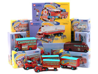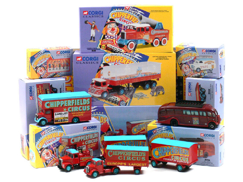 comprend : 2 AEC (autobus camping car & fourgon décors), 4 BEDFORD (service publicité, fourgon habillage, semi-remorque fourgon & semi-remorque transport de chevaux), ERF plateau, FODEN S21 semi-remorque transport d'hippopotames & crocodiles & 2 SCAMMELL (canon humain & remorques fourgon) - on y joint une boîte n°2 de personnages (manque une figurine) & un calendrier CHIPPERFIELDS de 1995