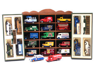 2 véhicules sans boîte - 15 modèles regroupés dans 5 coffrets - une camionnette de la marque OXFORD DIE-CAST - on y joint 2 vitrines en bois de la marque dont une avec boîte