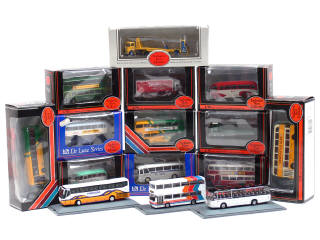 miniatures reproduisant notamment les modèles : AEC, MCW, DAIMLER, LEYLAND, BEDFORD, BRISTOL, HARRINGTON & DENNIS - on y retrouve les marques CORGI TOYS & EFE - un véhicule sans boîte - on y joint 3 camions ATKINSON - une boîte en état 'c' & quelques suremballages manquants