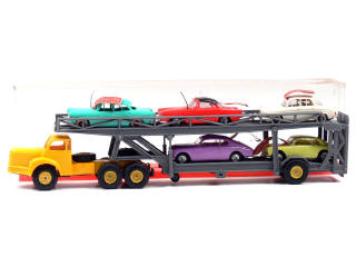 contient : SIMCA ARIANE, SIMCA PLEIN CIEL, RENAULT DAUPHINE, LANCIA AURELIA & ALFA ROMEO GIULIETTA SPRINT 1300 - toutes les voitures sont pourvues de leur étiquette d'origine 'RHODIALITE' - carrosseries très légèrement déformées - un petit défaut d'origine sur le vitrage du tracteur - une petite déchirure sur le blister de boîte - ENSEMBLE DANS UN ETAT EXCEPTIONNEL !