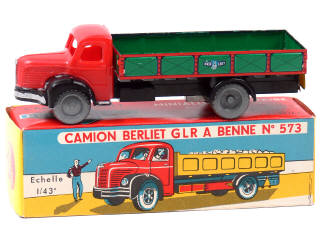longueur 20 cm - version promotionnelle avec marquages 'BERLIET' accompagnés du logo de la firme imprimés à l'intérieur du plateau & sur les ridelles - moteur à friction (fonctionne) - en tôle & plastique - la firme MINIALUXE s'est probablement chargée de la fabrication de la partie plastique du camion, tandis que MONT BLANC s'est chargé de la partie en tôle - SUPERBE !