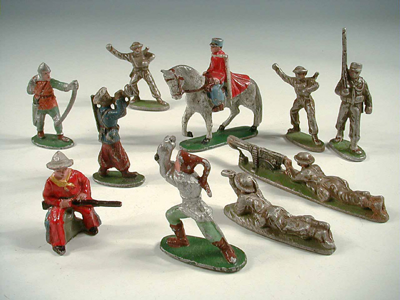 état de 'B' à 'E' - comprend : un cow-boy assis, deux hommes d'armes du moyen-âge, quatre soldats anglais au combat, un légionnaire, un officier spahi à cheval & un tirailleur marocain avec clairon