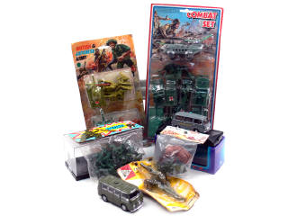 états de 'A' à 'B' - comprend : des figurines, des véhicules militaires & un canon - on y retrouve notamment les marques : TOOTSIETOY & RI TOYS - on y joint un ROMEO 2 'POLIZIA SCIENTIFICA' de la marque DeA & une FIAT 600T PULMINO 'GUARDIA DI FINANZIA' de la marque EXEM