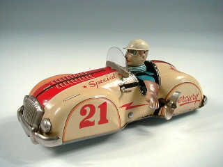 longueur 19 cm - en tôle litographiée - à mécanisme à ressort fait avancer la voiture pendant que le conducteur léve les bras vers la droite puis vers la gauche (fonctionne) - micro-retouches