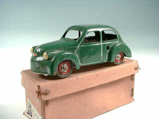 longueur 18 cm - moteur flottant à clef (fonctionne avec sa clef) - direction - notice explicative CIJ sur le fonctionnement du mécanisme sur la RENAULT 4CV - papier de protection & fiche de contrôle d'origine - l'étiquette PF collée sur la boîte représente la marque du distributeur PRESLES Frères, 6, Rue Sedaine à PARIS XIème - une pastille verte indique la couleur du jouet - SUPERBE !