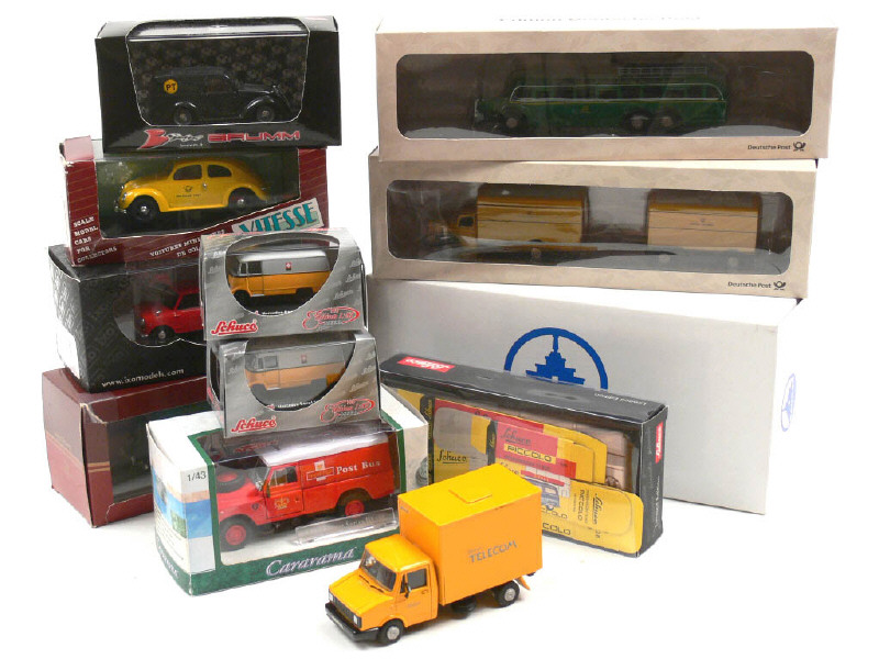 miniatures reproduisant notamment les modèles : FIAT, MERCEDES, LAND ROVER, VOLKSWAGEN, HANOMAG, MORRIS, FORD, LEYLAND & SAURER - on y retrouve les marques : SCHUCO (série PICCOLO), REXTOYS, IXO MODELS, VITESSE, CARARAMA, BUB, TEK-HOBY & ROXLEY MODELS - 2 boîtes en état 'c'