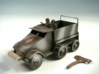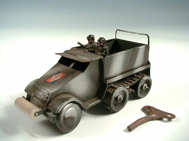 longueur 17,5 cm - moteur à clef (fonctionne) - véhicule avec la Croix de Lorraine sur le capot & direction - avec sa clef - chenilles sèches fendues