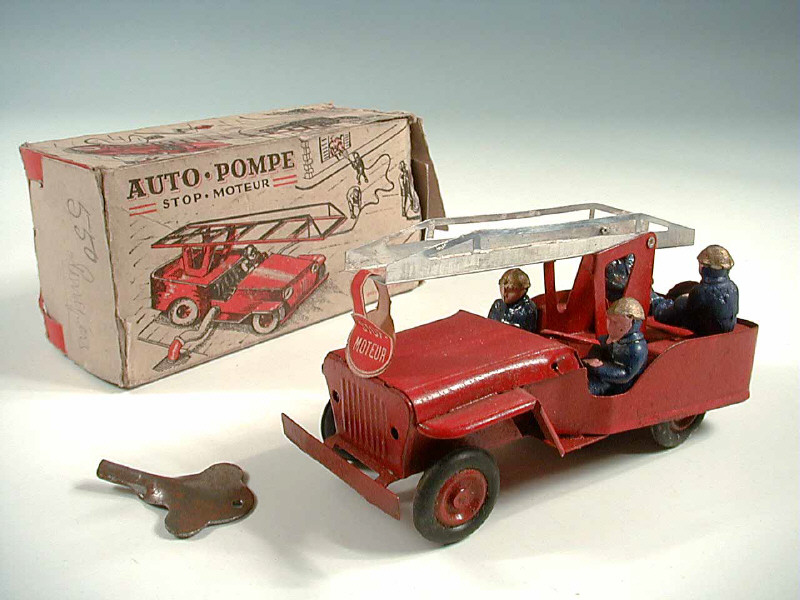 longueur 13,5 cm - moteur mécanique (fonctionne) - direction - avec 4 pompiers en composition - étiquette 'STOP-MOTEUR' non détachée