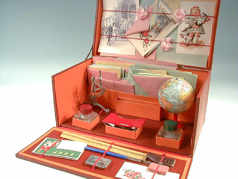 ensemble comprenant : bloc-notes, boîte de plumes, porte-plume, gomme, buvard à fleurs, échantillons de cuirs, double décimètre, encriers, tampon-buvard, pèse-lettres (manque plateau), mappemonde, enveloppes & papiers à lettre de couleur, cartes de voeux, etc... - ENSEMBLE EN SUPERBE ETAT DE CONVERSATION !