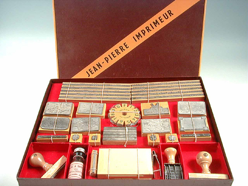 comprend un ensemble de tampons & de typons d'imprimerie, tampon dateur, encreur, pince à caractères, bouteille d'encre à tampon, etc... - l'ensemble jamais déballé