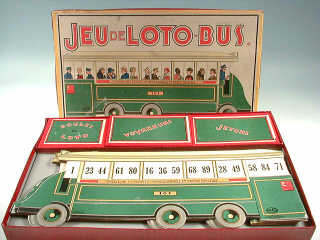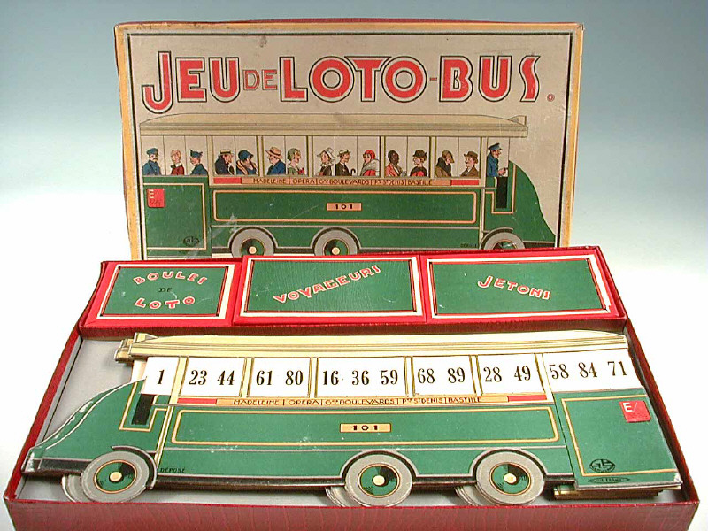 dimension 43 x 25 cm - comprend : 5 planches cartonnées en forme d'autobus parisiens & 3 superbes boîtes contenant les boules de Loto numérotées, les jetons cartonnés & les vignettes cartonnées représentant les passagers - les dessins & illustrations sont superbes !