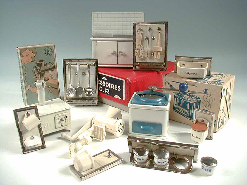 fabrication en fer blanc, bois & céramique - comprend : boîte de farine, rangement pour oignons, supports à tasses & savons, supports avec ustensiles de vaisselle, supports avec ustensiles de cuisine & étagère avec 3 pots THE - SUCRE - CAFE - on y joint 3 sachets d'origine 'd' estampillés 'OLLY'