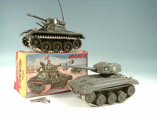 longueur 25 cm - moteur à clef (fonctionne) - mitrailleuses avec mécanisme de pierre à briquet - sachets d'accessoires comprenant : mitrailleuses de rechange équipées de pierres à briquet, clef, cible, billes pour le canon - ENSEMBLE JAMAIS UTILISE !