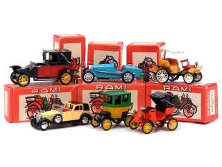 miniatures reproduisant les modèles : RENAULT (manque volant & colonne de direction), BUGATTI, ROCHET SCHNEIDER, GOBRON BRILLIE, DEDION BOUTON & HISPANO SUIZA (manque pare-chocs avant)