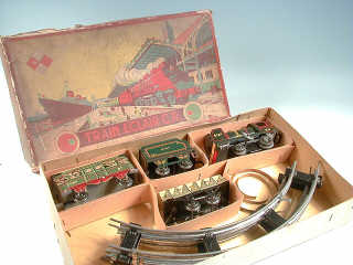 comprend : 1 locomotive à vapeur type 020 (mécanisme à clef à revoir), 1 tender, 1 wagon à bestiaux (avec portes coulissantes), 1 wagon plateau & 6 rails courbes - SUPERBE LITHOGRAPHIE !