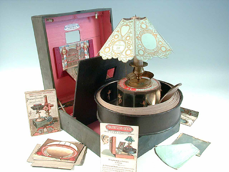 Le Praxinoscope a été inventé en 1877 par Emile Reynaud, professeur de science à Clermont-Ferrand - cet appareil d'optique, produit une illusion d'animation dûe au phénomène d'impression rétinienne - fabrication de 1878 (médaille d'argent à l'exposition internationale de Paris en 1879) - avec abat-jour dans son étui, plaques de décor, miroirs, 4 fiches publicitaires de l'époque & un dépliant cartonné présentant la gamme des produits REYNAUD : La toupie-fantoches - Le Praxinoscope - Le Praxinoscope-Théâtre - Le Praxinoscope à projection - ENSEMBLE EN ETAT EXCEPTIONNEL DE CONSERVATION POUR CET ANCETRE DU CINEMASCOPE !