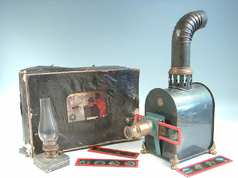 hauteur 41 cm - éclairage à lampe à pétrole (bloc intact) - le coffret comprend 24 barrettes d'animation en verre lithographié (une cassée) - on y joint une boîte de 12 mini-barrettes en verre de couleur