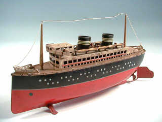ARNOLD (ALLEMAGNE) Paquebot à 2 cheminées en tôle lithographiée crème, noir & rouge