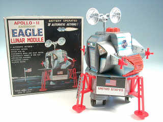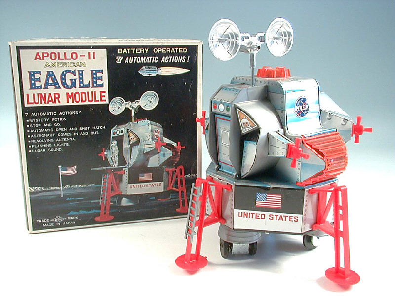 ce battery toy possède 7 actions automatiques, dont la sortie du cosmonaute par la porte du lem et la production d'un 'son lunaire étrange' - certains mécanismes sont à revoir