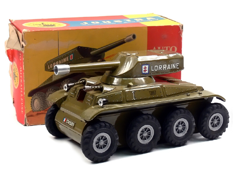 longueur 27 cm - moteur à clef (fonctionne poussivement) - en action, le blindé avance en imitant le bruit des tirs d'obus - étincelles avec mécanisme de pierre à briquet (à revoir avec transparent coloré en partie brûlé) - manque antenne, les 2 outils & une de leurs fixations